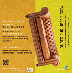 Es geht weiter! Das KunstForumEifel hat einen neuen Vorstand. Es bleibt uns also als lebendiger Begegnungsort in der Eifel erhalten und hat direkt eine neue Ausstellung zu bieten. Bis zum 31. Januar ist Bilder für über’s Sofa! Ein Kunstmarkt in Schleiden zu sehen. Kunst braucht Brot, - und wir alle brauchen Kunst, denn nichts mag so sehr die Notwendigkeit von Kunst zu beweisen wie eine leere Wand über’m Sofa. Also hin da!